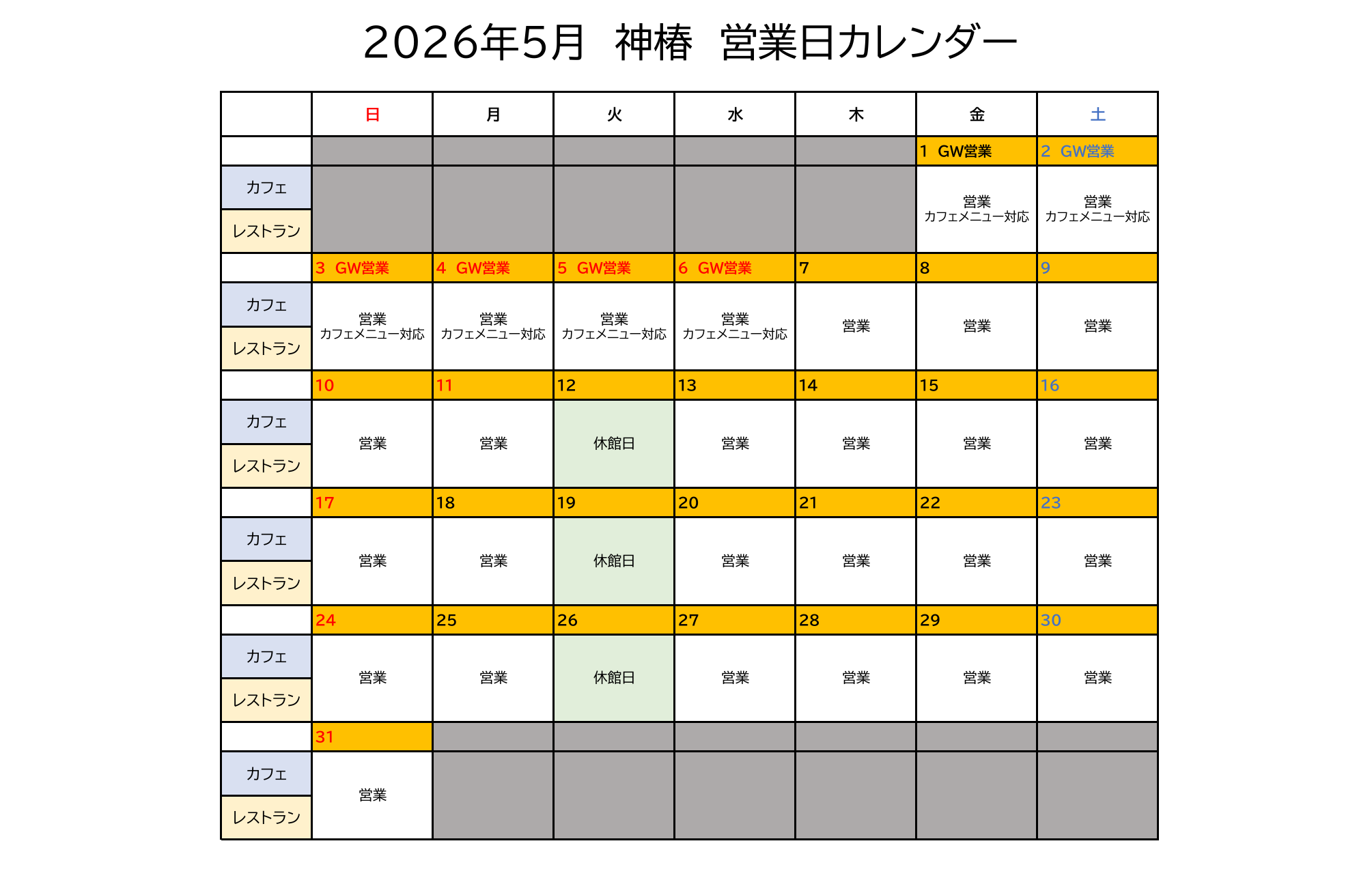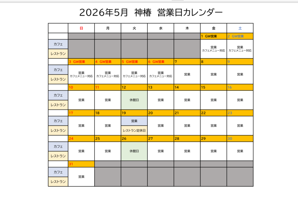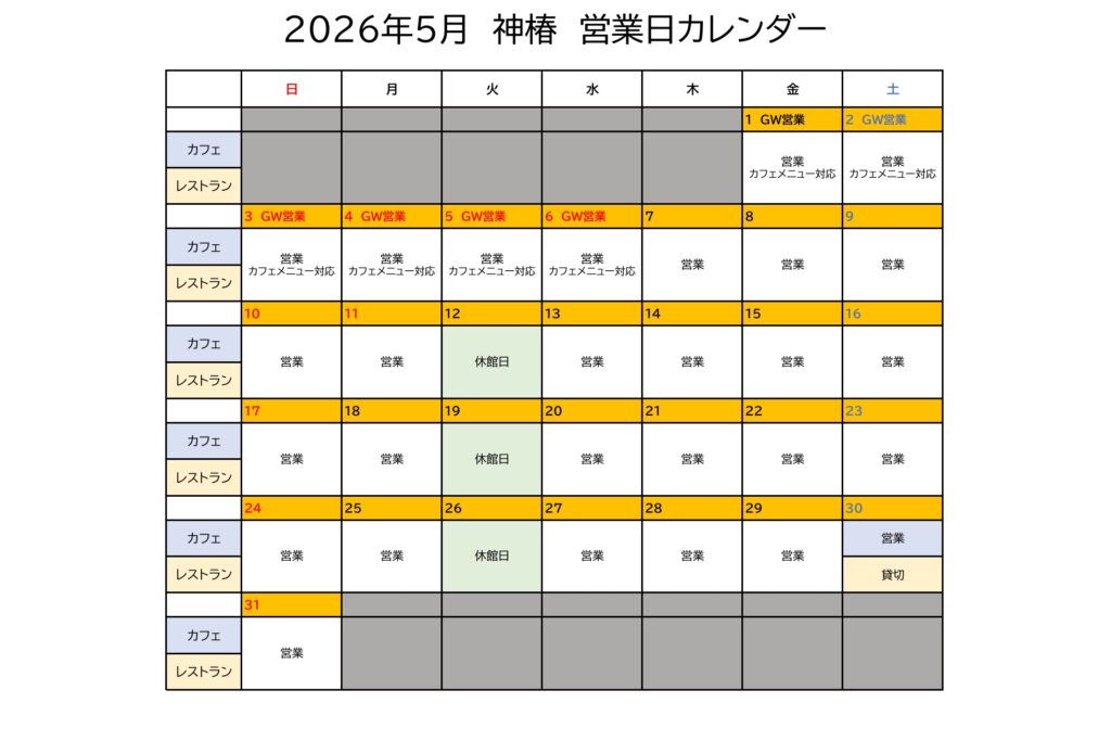 2026年5月 営業日のご案内 2026.02.28 お知らせ 平素は当店をご利用いただき誠にありがとうございます。2026年5月は下記の通り営業いたします。皆さまのご来店を心よりお待ちしております。※休館日は駐車場もご利用いただけませんのでご注意ください。※カフェのご予約は承っておりません。(レストランのみご予約を承っております。)通常営業時間2F Cafe10:00~ 17:00(16:30 L.O)1F RestaurantLunch 11:30 ~ 15:00(14:00 L.O) このページをSNSでシェアする