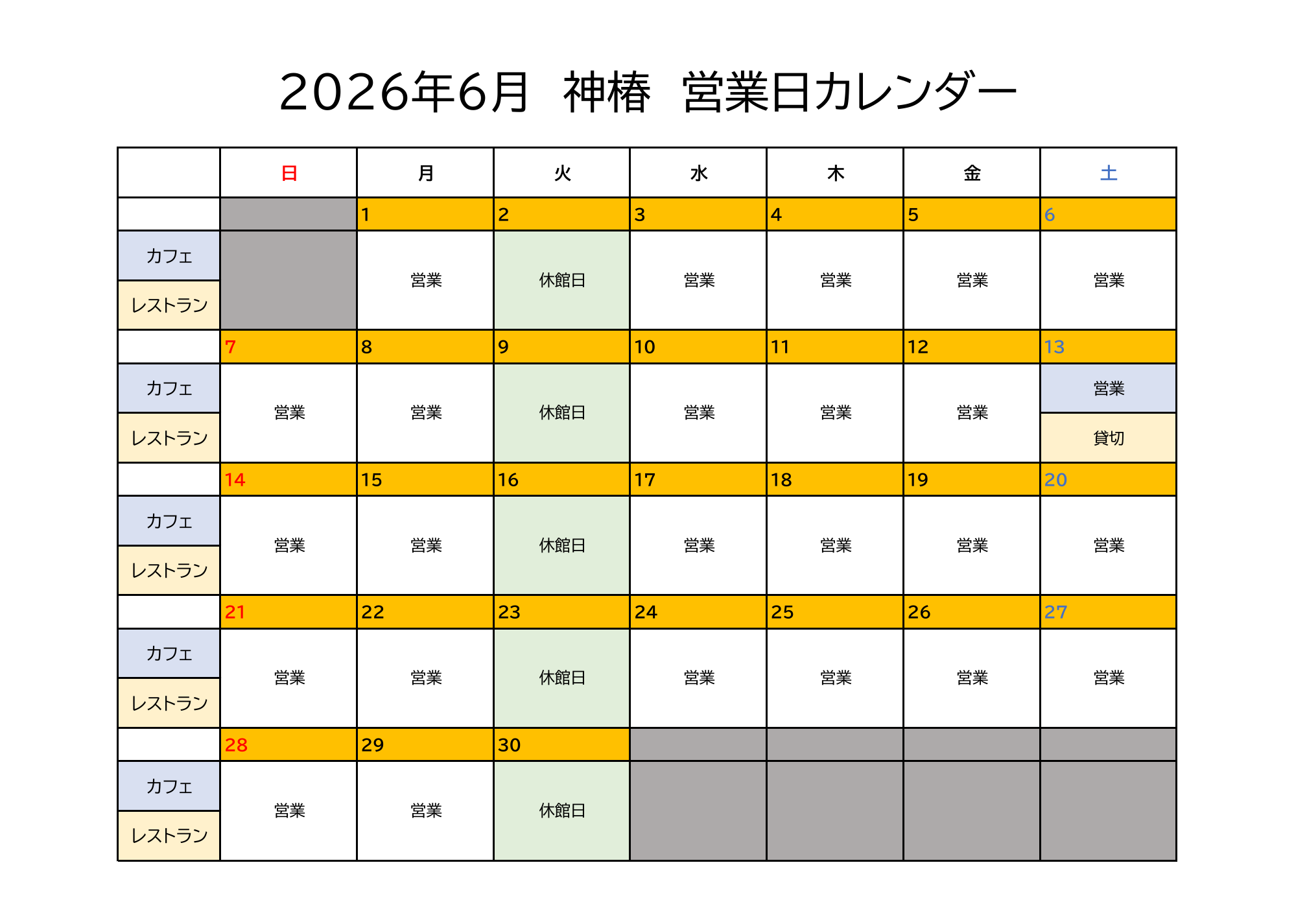 2026年6月 営業日のご案内 2026.04.02 お知らせ 平素は当店をご利用いただき誠にありがとうございます。2026年6月は下記の通り営業いたします。皆さまのご来店を心よりお待ちしております。※休館日は駐車場もご利用いただけませんのでご注意ください。※カフェのご予約は承っておりません。(レストランのみご予約を承っております。)通常営業時間2F Cafe10:00~ 17:00(16:30 L.O)1F RestaurantLunch 11:30 ~ 15:00(14:00 L.O) このページをSNSでシェアする