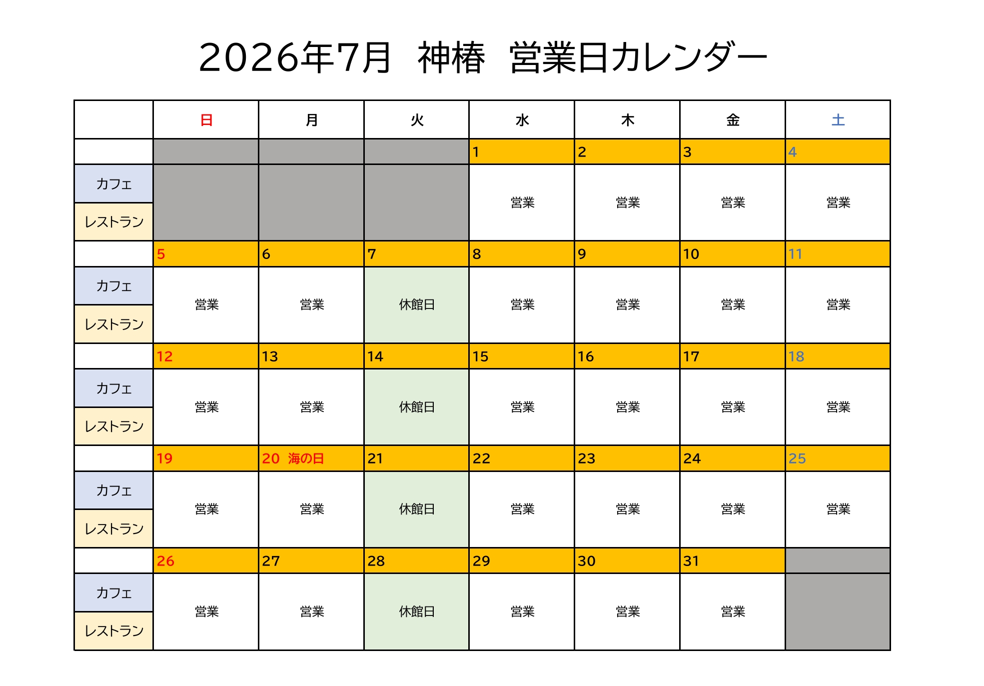 2026年7月 営業日のご案内 2026.04.15 お知らせ 平素は当店をご利用いただき誠にありがとうございます。2026年7月は下記の通り営業いたします。皆さまのご来店を心よりお待ちしております。※休館日は駐車場もご利用いただけませんのでご注意ください。※カフェのご予約は承っておりません。(レストランのみご予約を承っております。)通常営業時間2F Cafe10:00~ 17:00(16:30 L.O)1F RestaurantLunch 11:30 ~ 15:00(14:00 L.O) このページをSNSでシェアする