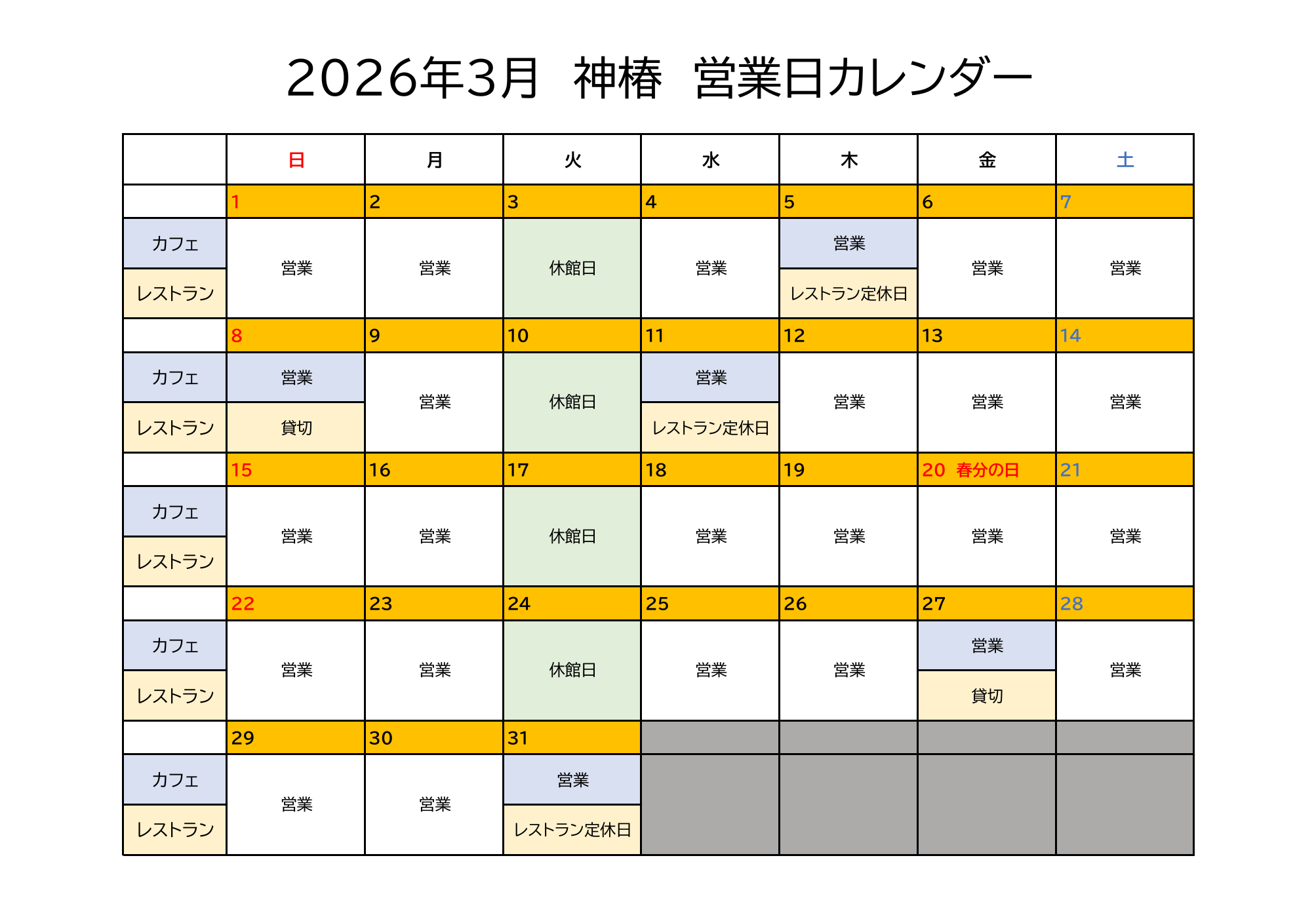 2026年3月 営業日のご案内 2026.02.28 お知らせ 平素は当店をご利用いただき誠にありがとうございます。2026年3月は下記の通り営業いたします。皆さまのご来店を心よりお待ちしております。※休館日は駐車場もご利用いただけませんのでご注意ください。※カフェのご予約は承っておりません。(レストランのみご予約を承っております。)通常営業時間2F Cafe10:00~ 17:00(16:30 L.O)1F RestaurantLunch 11:30 ~ 15:00(14:00 L.O) このページをSNSでシェアする