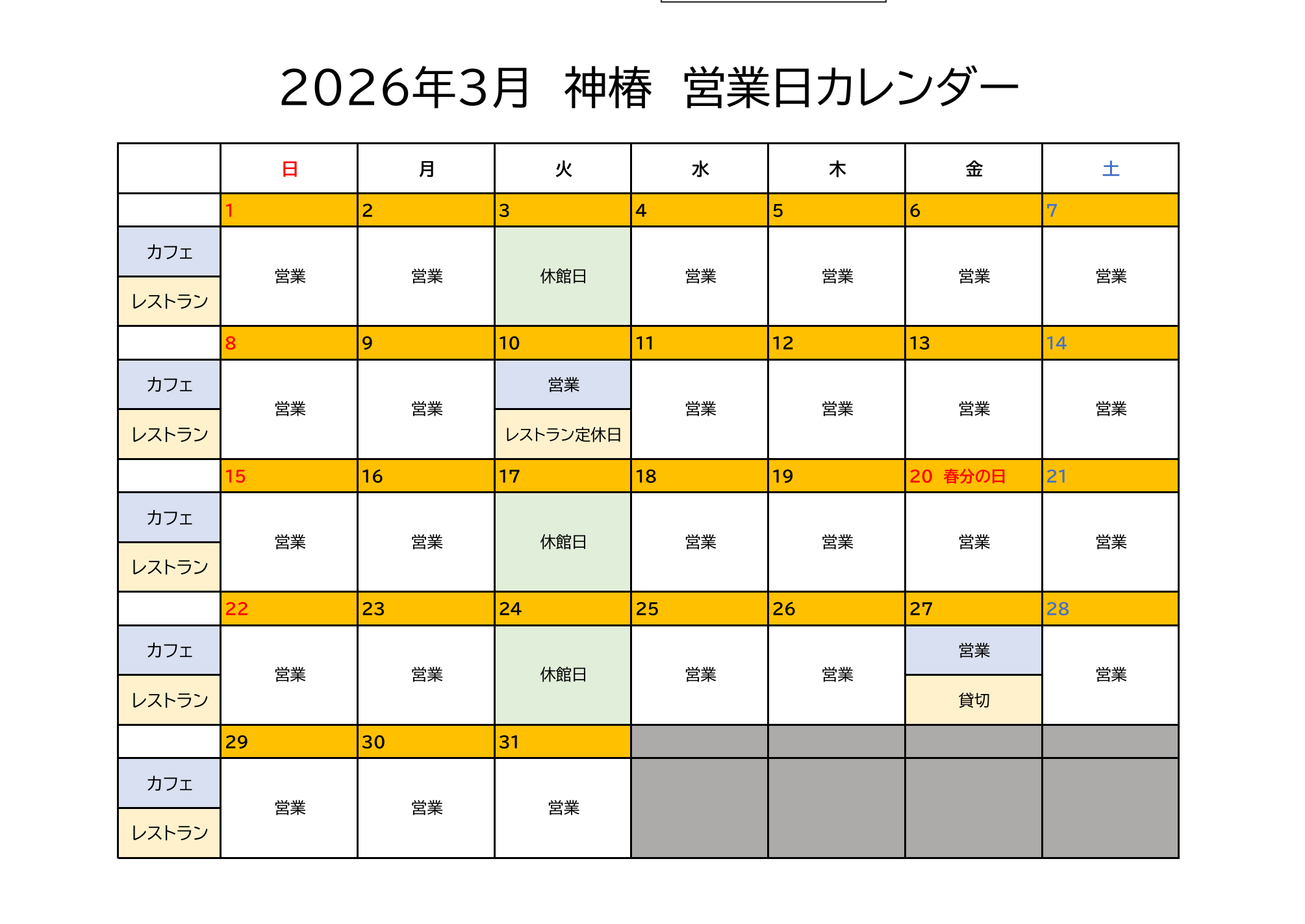 2026年3月 営業日のご案内 2025.12.12 お知らせ 平素は当店をご利用いただき誠にありがとうございます。2026年3月は下記の通り営業いたします。皆さまのご来店を心よりお待ちしております。※休館日は駐車場もご利用いただけませんのでご注意ください。※カフェのご予約は承っておりません。(レストランのみご予約を承っております。)通常営業時間2F Cafe10:00~ 17:00(16:30 L.O)1F RestaurantLunch 11:30 ~ 15:00(14:00 L.O) このページをSNSでシェアする